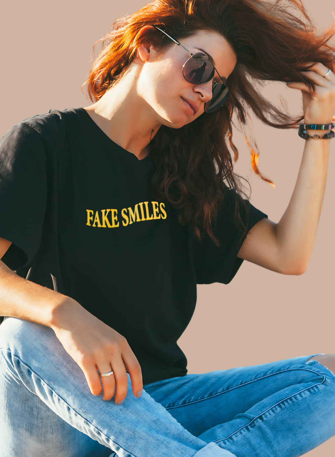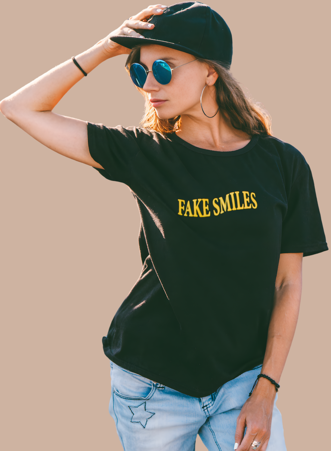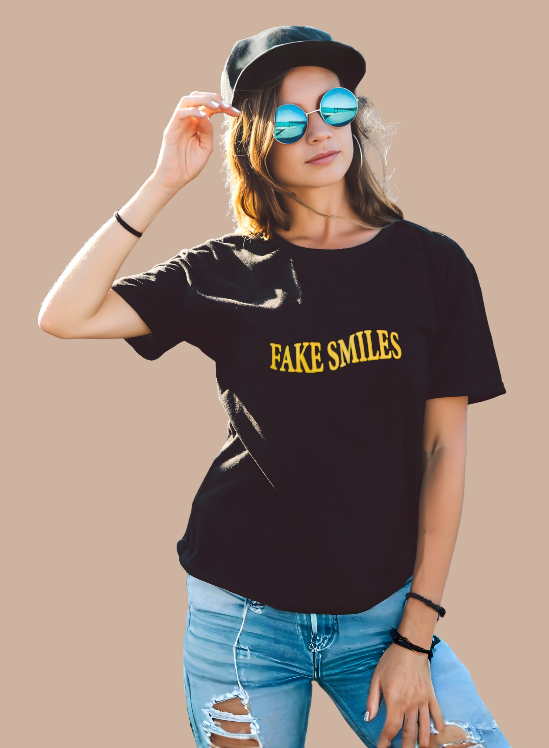 Express your attitude with confidence in our “Fake Smiles” graphic tee. Crafted from soft, breathable cotton, this black t-shirt blends comfort with a bold statement. The eye-catching yellow typography across the chest adds a street-style edge, perfect for casual outings, concerts, or just chilling with friends.