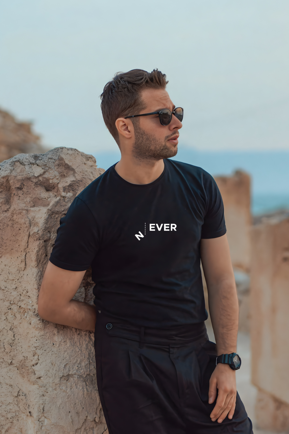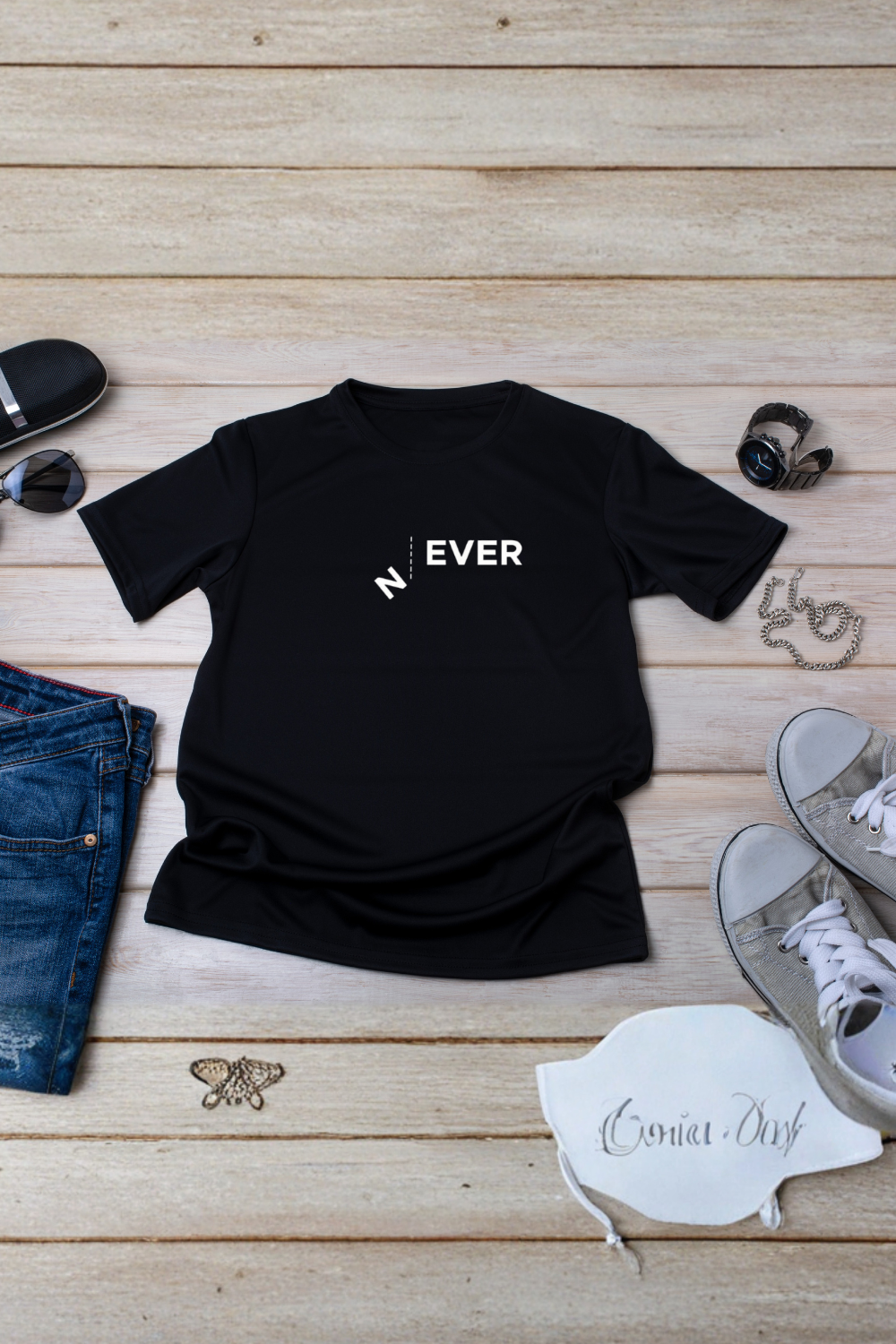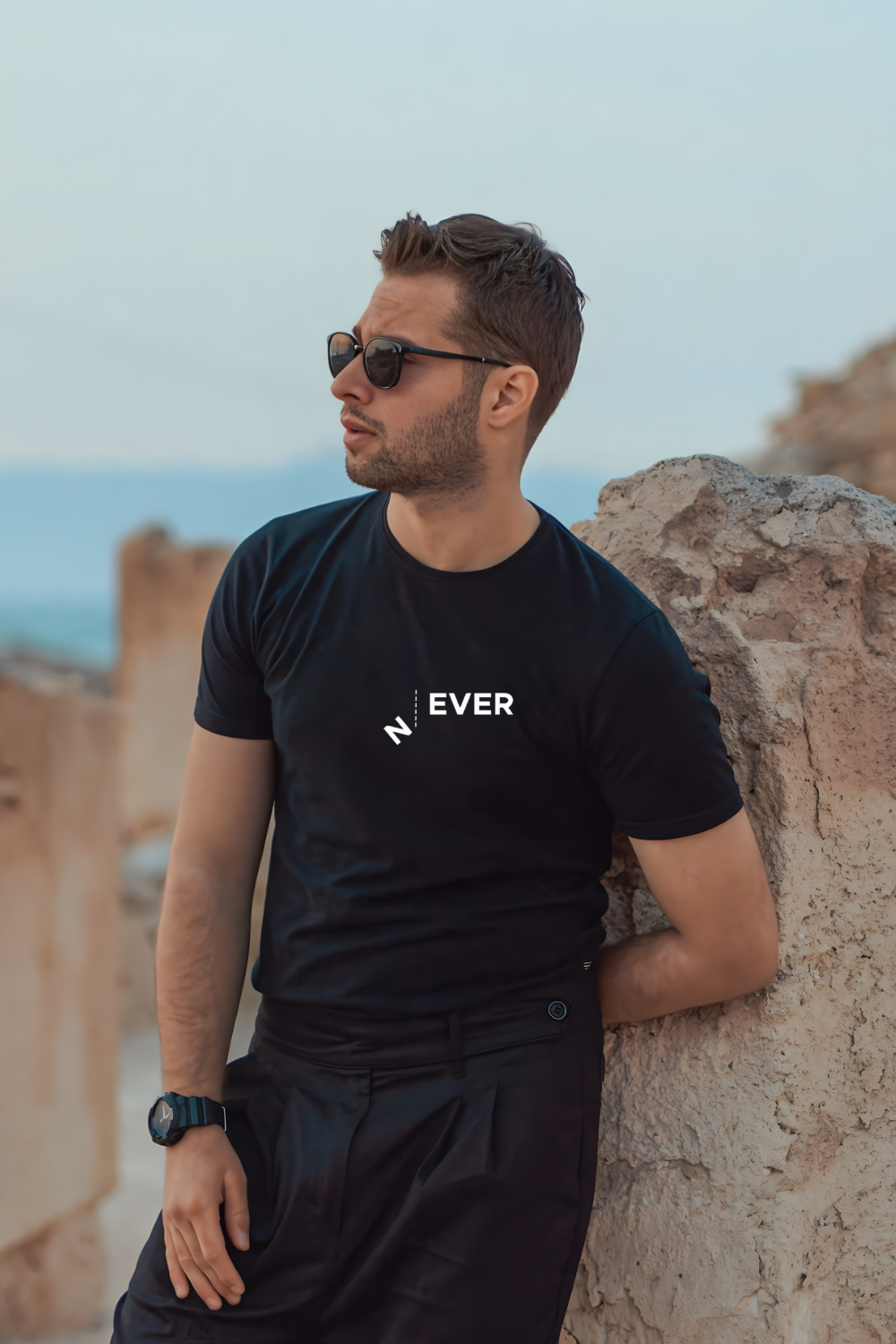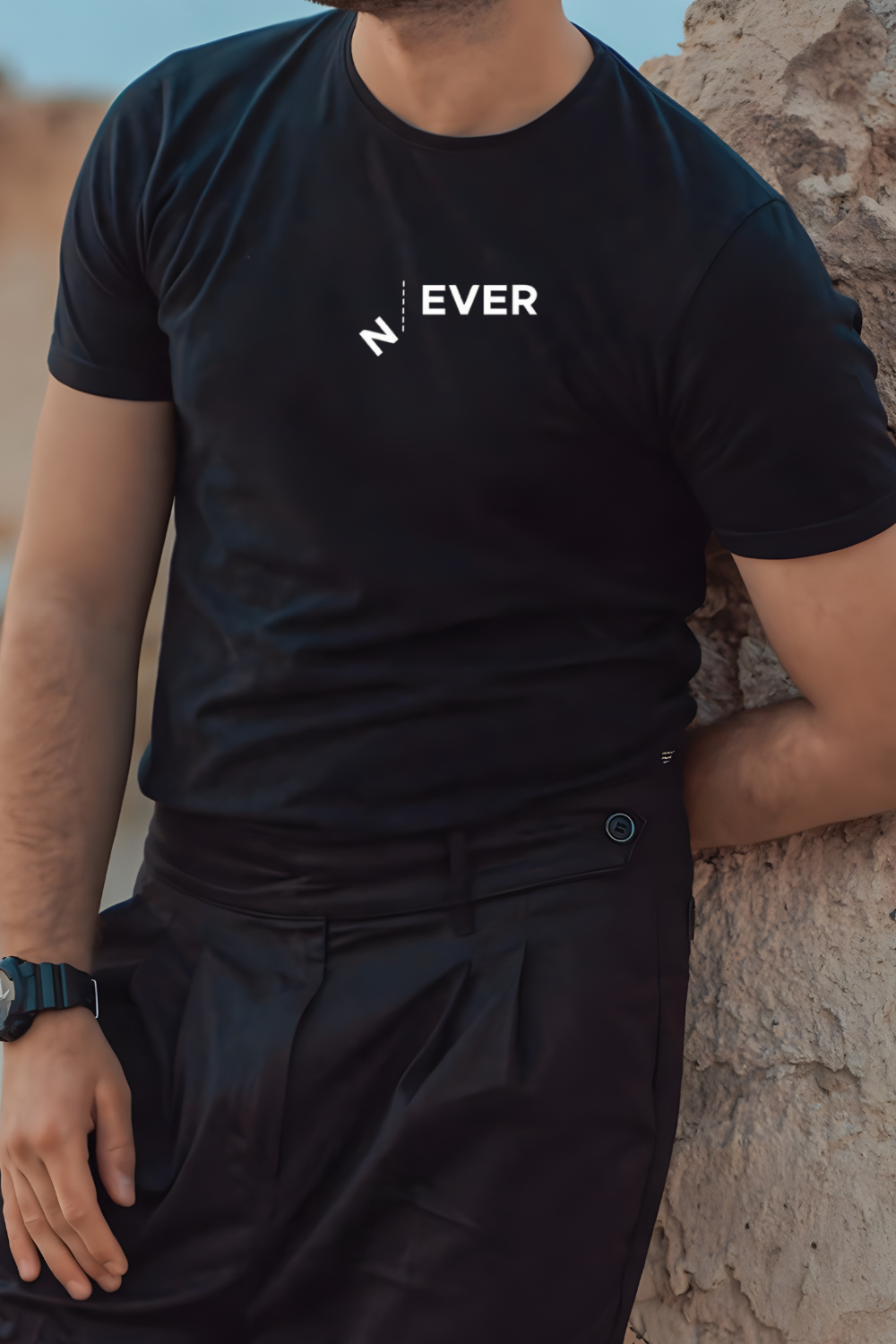 Step into effortless style with our NEVER Minimalist Black T-Shirt, designed for those who believe in bold simplicity. Crafted from premium 100% cotton, this tee offers unmatched comfort, breathability, and a sleek fit that complements any look — casual or smart.