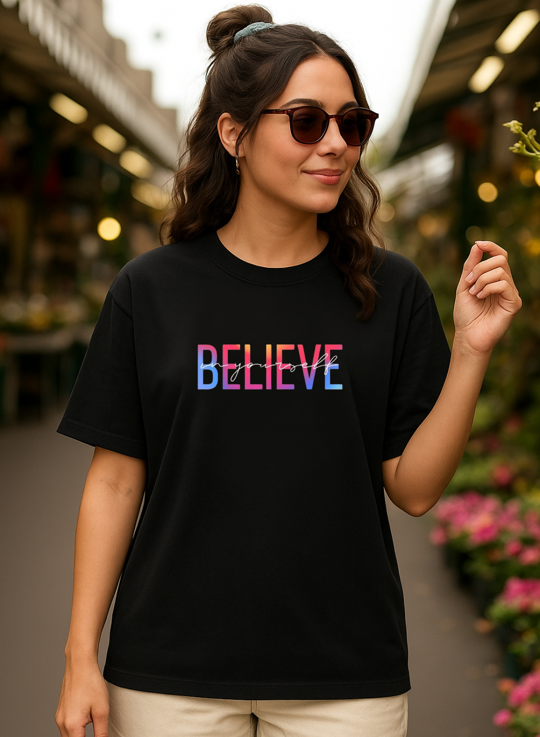 Stay confident and comfortable in this stylish “Believe in Yourself” oversized black T-shirt. Designed for women who love fashion with purpose, this tee features a vibrant multicolor text print that inspires positivity and self-belief.